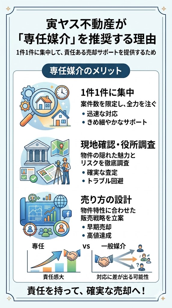 寅ヤス不動産では、ご依頼をお受けする際は「専任」でのご契約をお願いしています。
